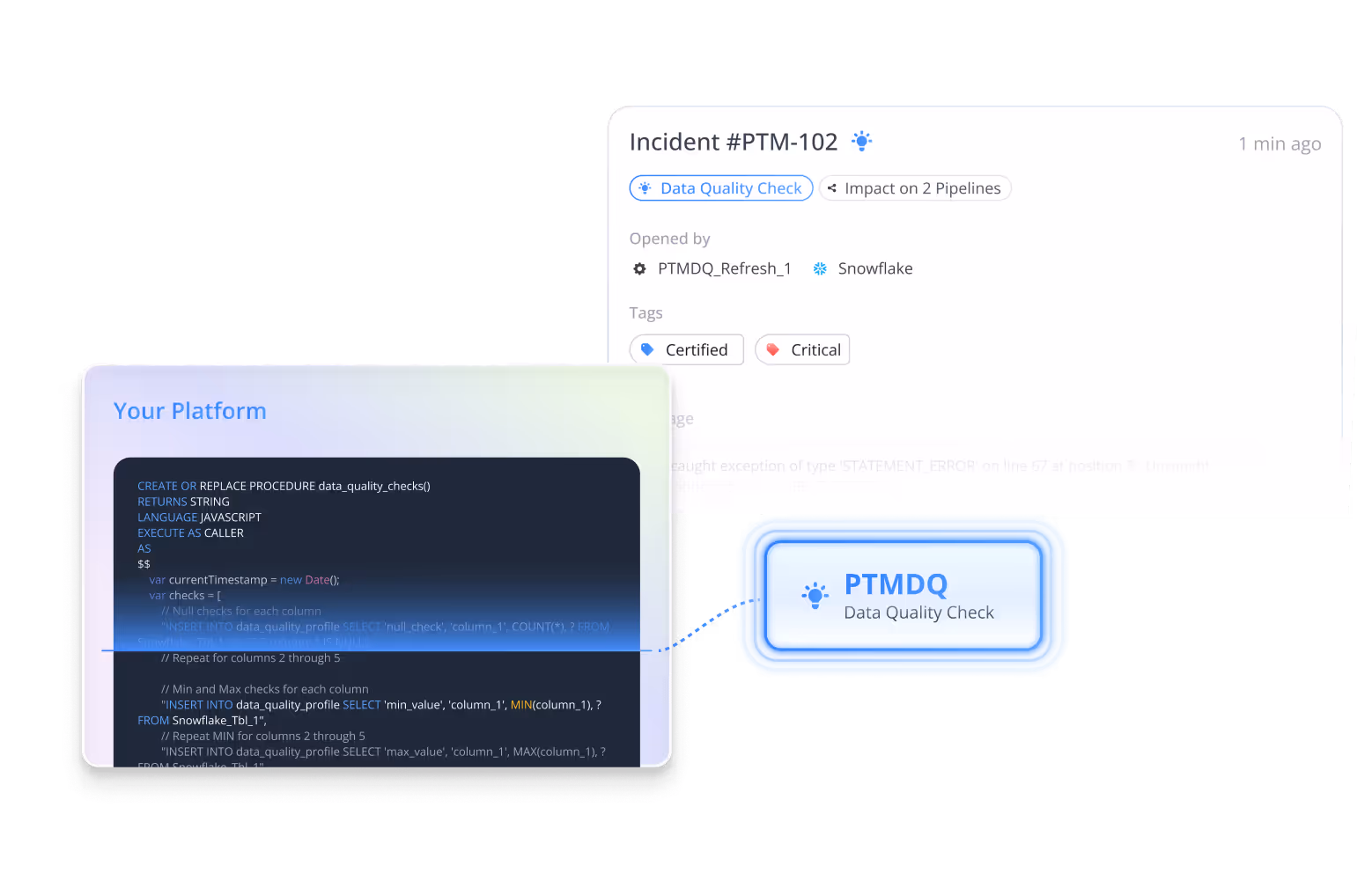 Integrate custom data quality and profiling checks seamlessly within your data pipelines by leveraging your in platform checks for both data engineers and business users alike, maintain security without sacrificing control. Enhance data observability by automatically detecting Data Quality checks and creating associations to the datasets they monitor.