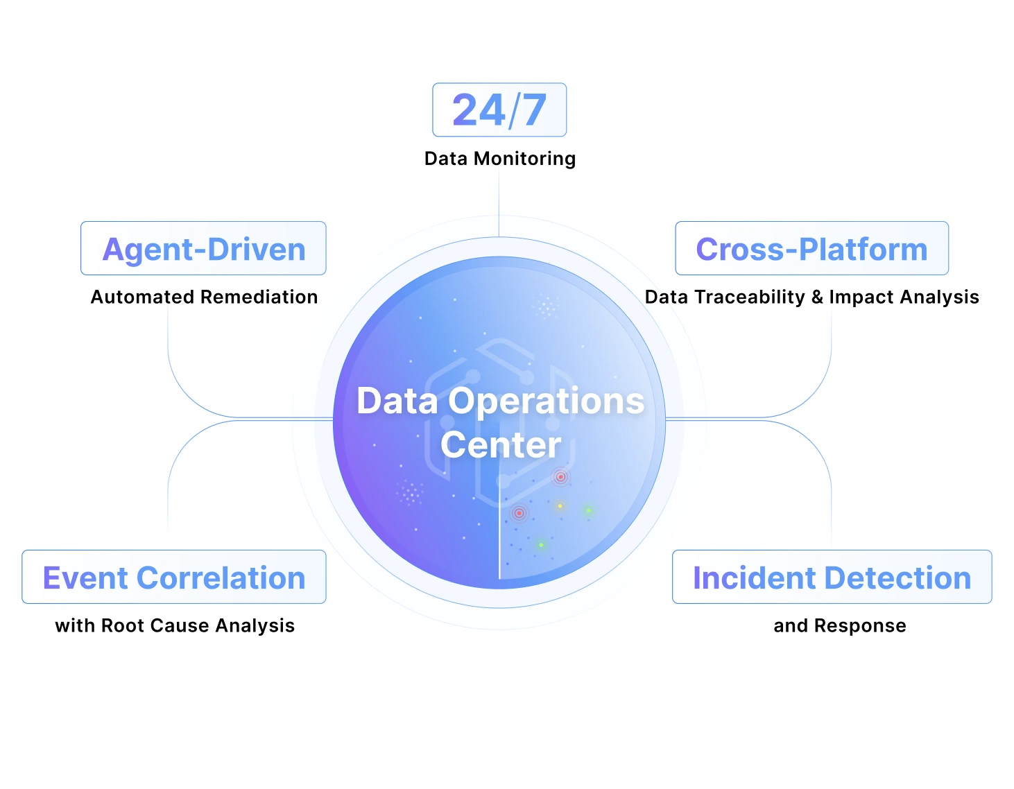 AI-powered Data Operations Centers run 24/7, continuously monitoring all flow of data across the cross-platform data ecosystem to ensure trustworthy consumption of data by both humans and AI agents.